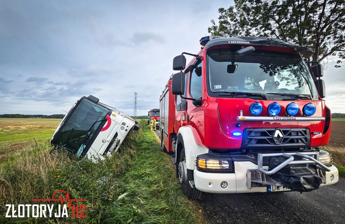 Niebezpieczne zdarzenie pod Złotoryją. Autobus z dziećmi wylądował w rowie