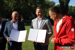 Wiceminister Piotr Borys ogłosił przekazanie znaczących środków na odbudowę i rozwój infrastruktury sportowej, a następnie wręczył Burmistrzowi i Wójtowi decyzję o przyznaniu środków: