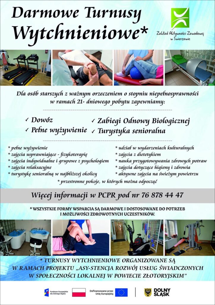 Osoby starsze posiadające ważne orzeczenie o stopniu niepełnosprawności mogą skorzystać z bezpłatnych, 21-dniowych turnusów wytchnieniowych organizowanych w Świerzawie. Program skierowany jest do seniorów potrzebujących wsparcia w codziennym funkcjonowaniu oraz regeneracji zdrowia.