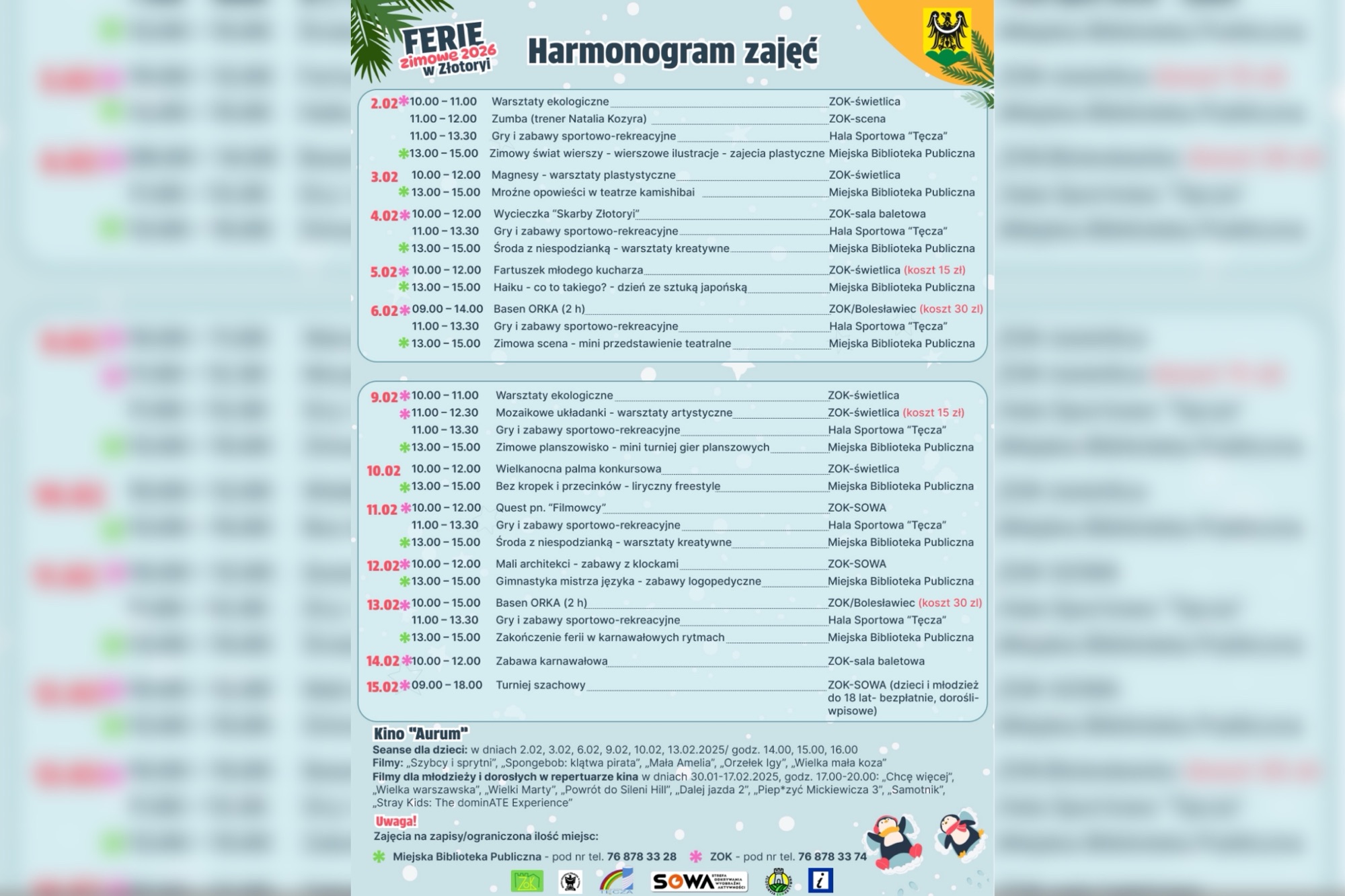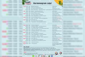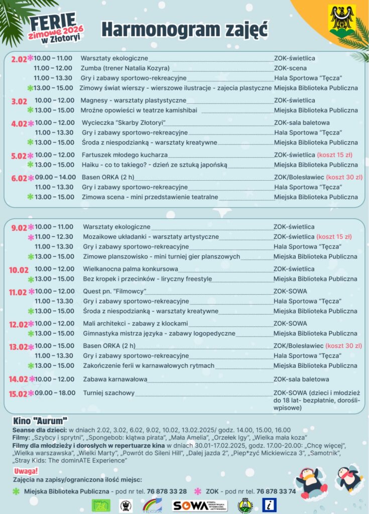 Szczegółowy harmonogram wydarzeń, wraz z godzinami i miejscami ich realizacji, dostępny jest na plakacie informacyjnym. Zachęcamy do zapoznania się z nim i skorzystania z przygotowanych atrakcji. Ferie zimowe w Złotoryi zapowiadają się aktywnie, kreatywnie i pełne pozytywnych emocji.