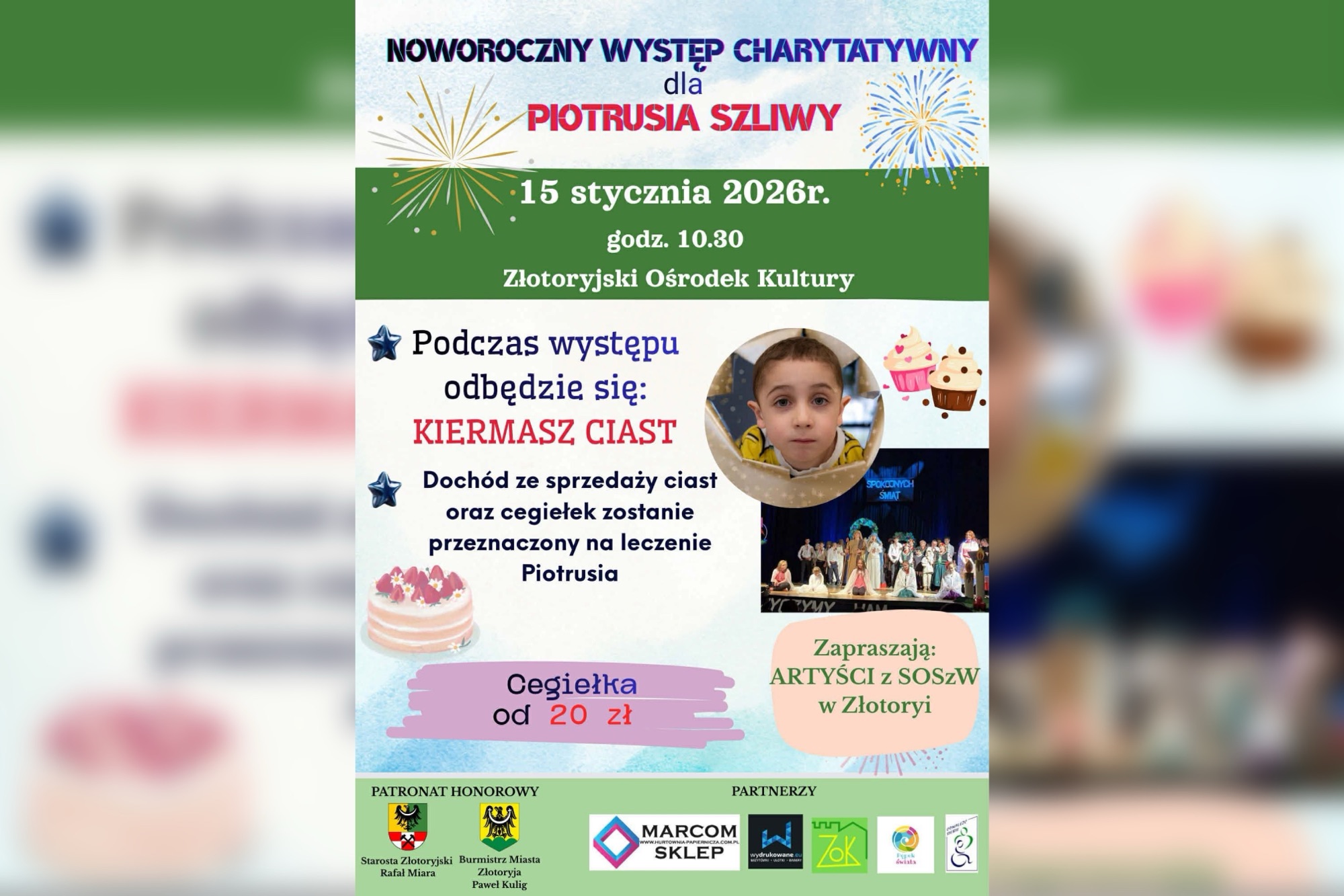 Już 15 stycznia w Złotoryi odbędzie się wyjątkowe wydarzenie charytatywne, którego celem jest wsparcie leczenia Piotrusia Szliwy. Na scenie Złotoryjskiego Ośrodka Kultury o godzinie 10:30 zaprezentują się młodzi artyści z Ośrodka Szkolno-Wychowawczego im. Janusza Korczaka w Złotoryi, przygotowując specjalny występ pełen zaangażowania i serca.