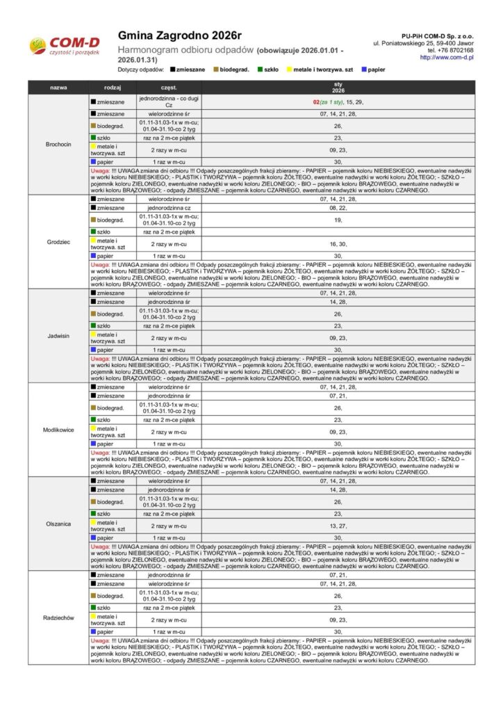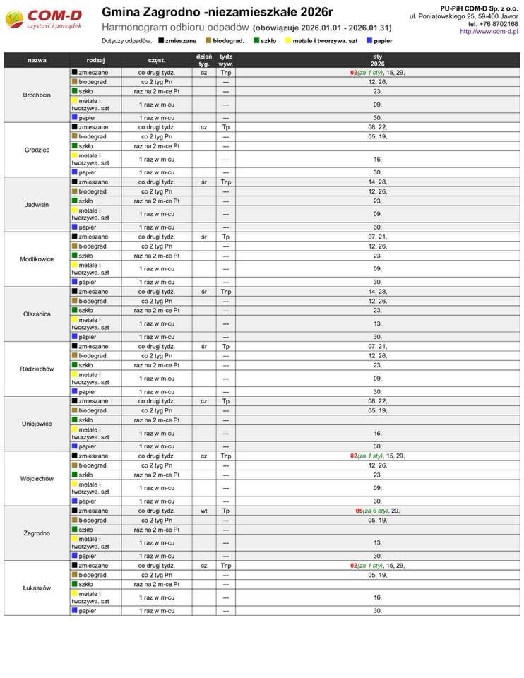 Harmonogram wywozu odpadów komunalnych w Gminie Zagrodno na styczeń