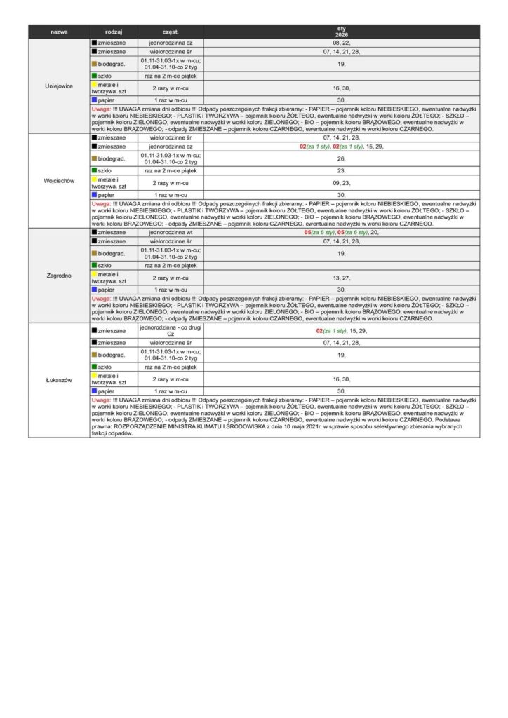 Prosimy o zapoznanie się z harmonogramem oraz o wystawianie pojemników i worków w dniu planowanego odbioru, najlepiej w godzinach porannych. Dziękujemy za współpracę, dbałość o porządek oraz właściwą segregację odpadów, która ma istotne znaczenie dla ochrony środowiska i estetyki naszej gminy.