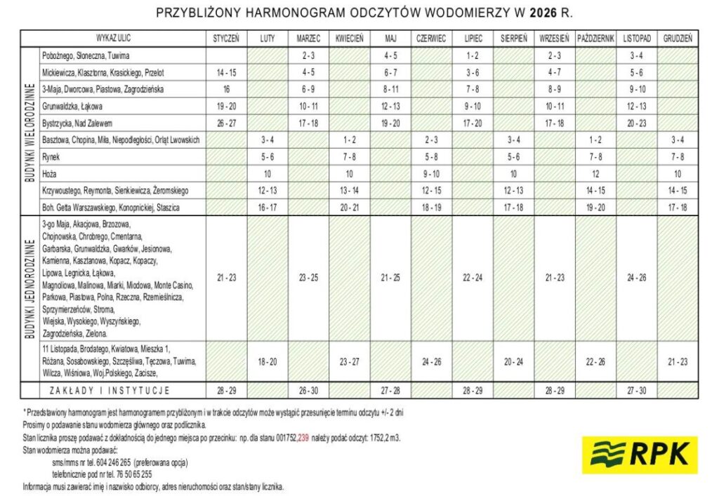 Rejonowe Przedsiębiorstwo Komunalne w Złotoryi opublikowało dziś harmonogram odczytów wodomierzy obowiązujący na cały 2026 rok. Zestawienie ma ułatwić mieszkańcom regularne i terminowe przekazywanie stanów liczników do miejskiej spółki.