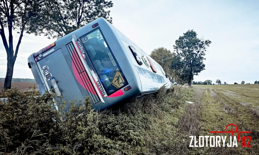 Niebezpieczne zdarzenie pod Złotoryją. Autobus z dziećmi wylądował w rowie