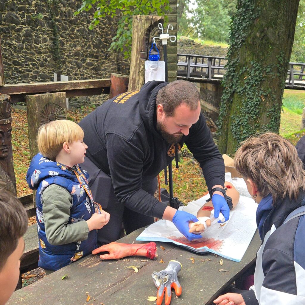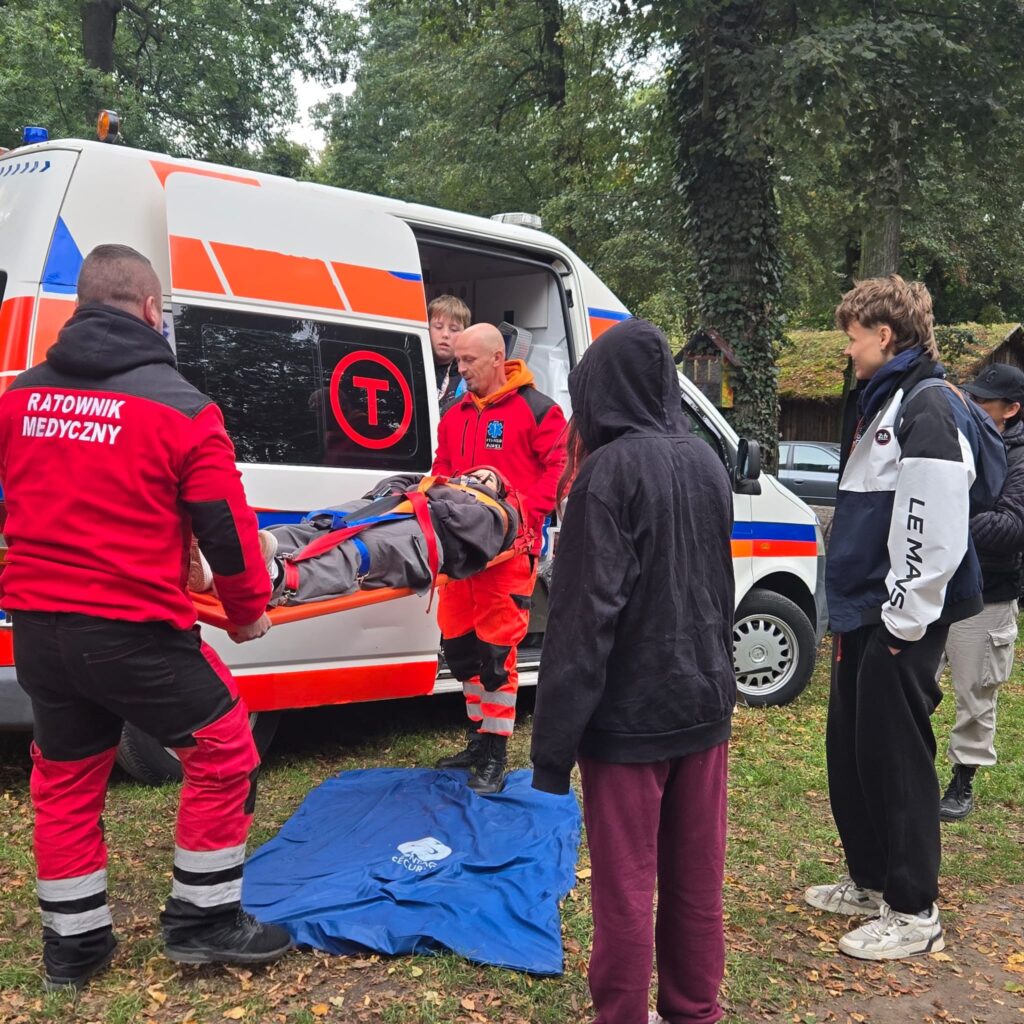 Uczestnicy mieli również okazję zapoznać się z wyposażeniem ambulansu oraz wziąć udział w pokazie działań ratowniczych przygotowanym przez profesjonalistów. Dużym zainteresowaniem cieszyła się także prezentacja sprzętu OSP oraz możliwość zwiedzania Zamku Grodziec – wszystko to dzięki życzliwości jego władz.