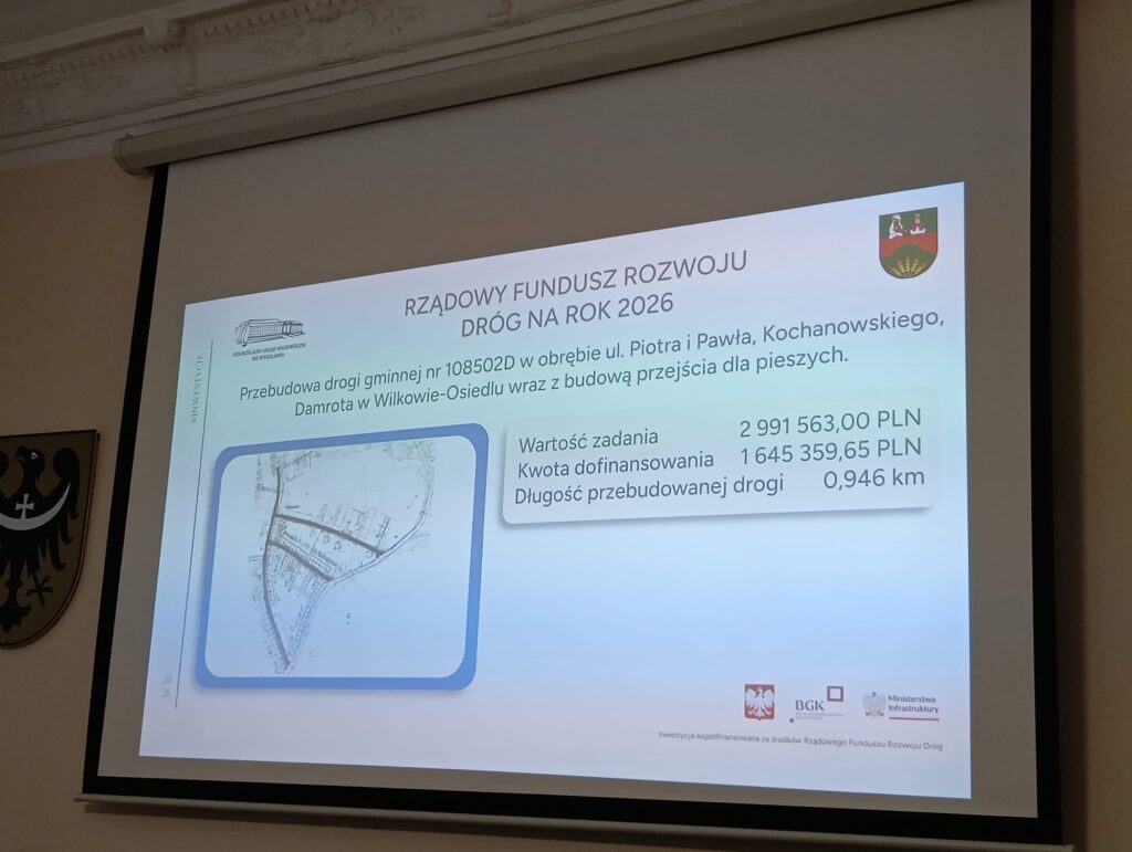 Podczas konferencji poinformowano, że inwestycja z terenu Gminy Złotoryja znalazła się na liście zadań, które otrzymają dofinansowanie. Wsparcie finansowe zostanie przeznaczone na przebudowę drogi gminnej nr 108502D w obrębie ulic Piotra i Pawła, Kochanowskiego oraz Damrota w Wilkowie-Osiedlu, wraz z budową przejścia dla pieszych.