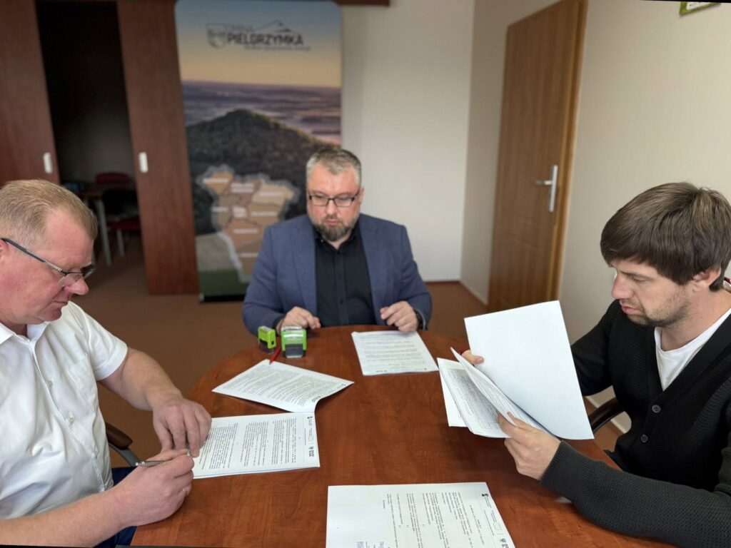 30 września została podpisana umowa z wykonawcą – Przedsiębiorstwem Transportowo-Budowlanym Sp. z o.o., które reprezentował pan Mateusz Chamski. Ze strony Gminy Pielgrzymka podpisy złożyli Skarbnik Andrzej Chodyra oraz Wójt Tomasz Sybis.