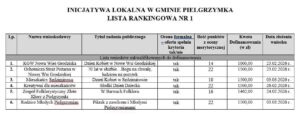 W Gminie Pielgrzymka ogłoszono wyniki pierwszej listy rankingowej w ramach inicjatywy lokalnej. Do dofinansowania zakwalifikowano sześć projektów zgłoszonych przez mieszkańców oraz lokalne organizacje. Inicjatywy obejmują wydarzenia integracyjne, kulturalne i społeczne, które będą realizowane w najbliższym czasie na terenie gminy.