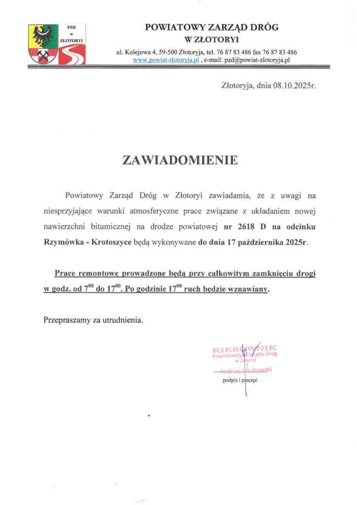 Powiatowy Zarząd Dróg w Złotoryi poinformował, że z powodu niesprzyjających warunków atmosferycznych prace związane z układaniem nowej nawierzchni bitumicznej na drodze powiatowej nr 2618D, na odcinku Rzymówka – Krotoszyce, zostaną przedłużone do 17 października 2025 roku.