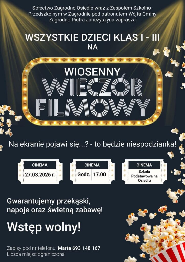 Sołectwo Zagrodno-Osiedle wspólnie z Zespołem Szkolno-Przedszkolnym w Zagrodnie organizują wyjątkowe wydarzenie dla najmłodszych mieszkańców. Pod patronatem Wójta Gminy Zagrodno, Piotra Janczyszyna, odbędzie się Wiosenny Wieczór Filmów skierowany do uczniów klas I–III.