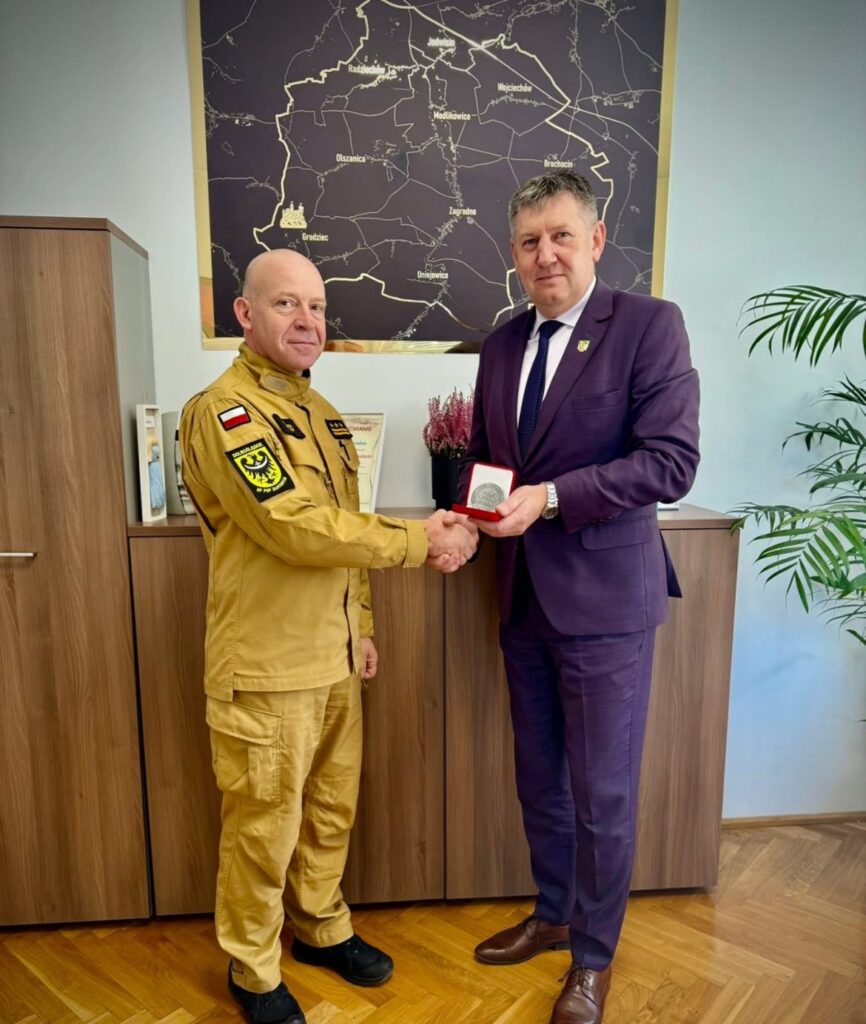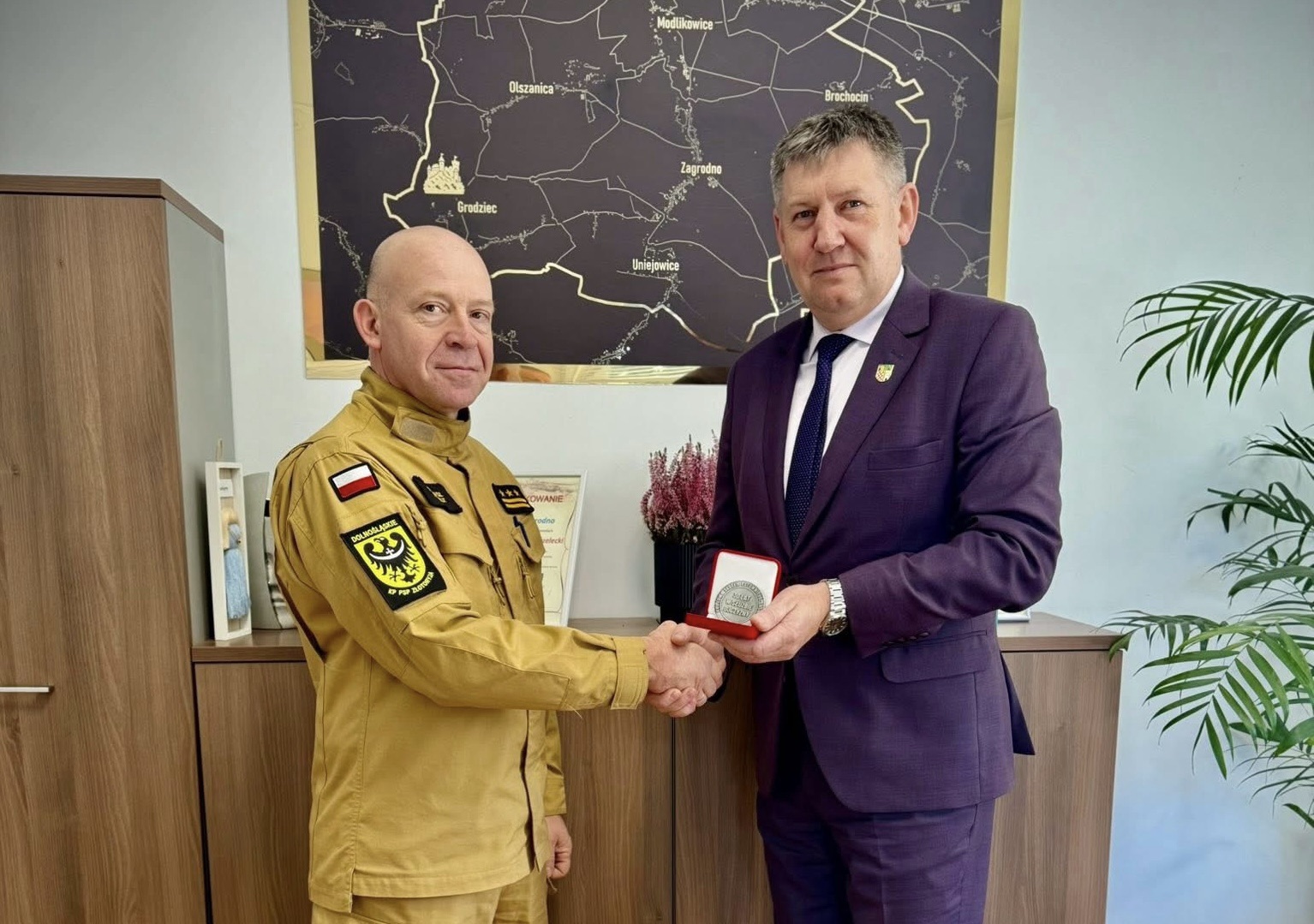 Wójt gminy Zagrodno odebrał okolicznościowy medal przyznany za jego wkład w rozwój lokalnego systemu bezpieczeństwa oraz stałe wsparcie udzielane jednostkom ochrony przeciwpożarowej. Wyróżnienie wręczył st. bryg. Tomasz Herbut, Komendant Komendy Powiatowej Państwowej Straży Pożarnej w Złotoryi. To ważny gest, który potwierdza zaufanie oraz dobrą współpracę pomiędzy samorządem a strażakami dbającymi o bezpieczeństwo lokalnej społeczności.