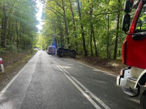 Po przybyciu służb na miejsce zdarzenia ustalono, że samochód osobowy typu bus dachował i leżał na boku, częściowo blokując jeden pas ruchu. Autem podróżowały dwie osoby, które opuściły pojazd o własnych siłach przed przybyciem ratowników.