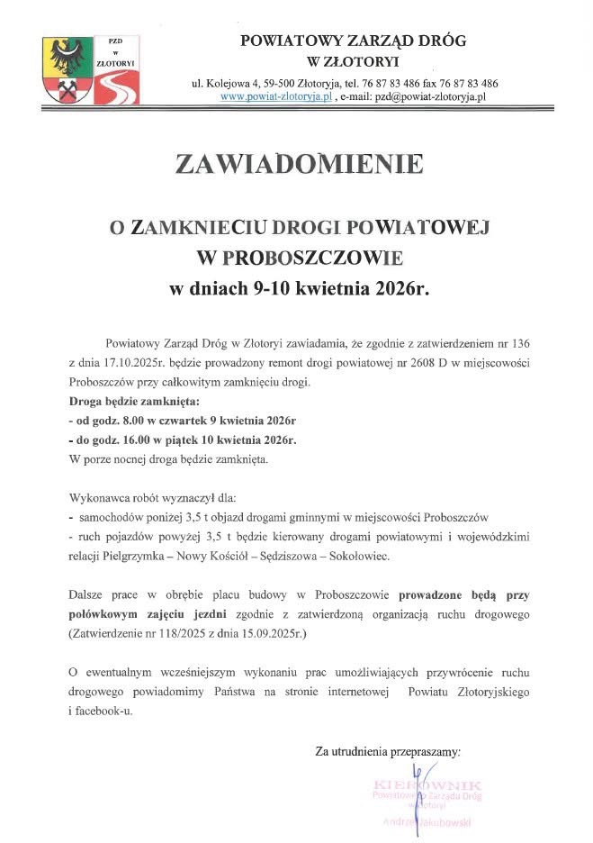 Zamknięcie drogi powiatowej w Proboszczowie – ważna informacja dla kierowców