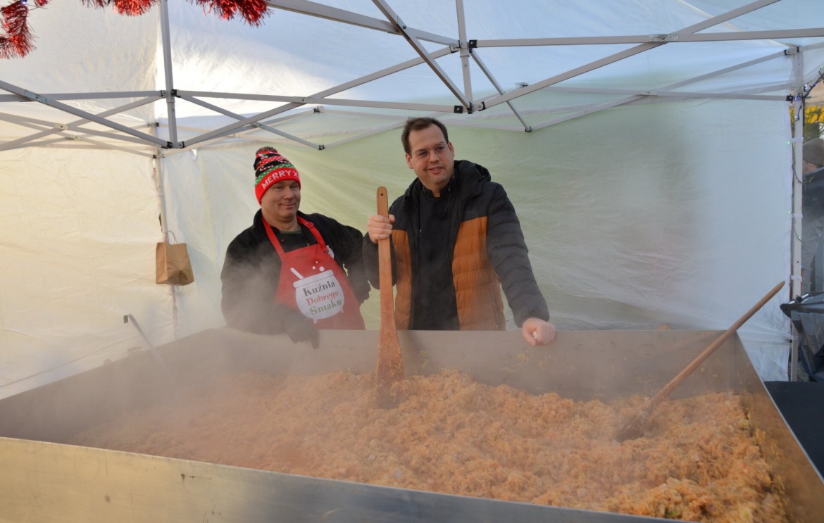 Aromatyczny bigos, świąteczna atmosfera i tłumy mieszkańców – tak wyglądała niedziela na złotoryjskim Rynku podczas Jarmarku Mieszczańskiego. Gwiazdą dnia był Jakub Kuroń – kucharz, autor książek kulinarnych i kontynuator rodzinnych tradycji, wnuk Jacka Kuronia i syn Macieja Kuronia. Po raz pierwszy odwiedził Złotoryję, serwując mieszkańcom pachnącą kapustę z wieprzowiną, grzybami, śliwkami, czosnkiem, cebulą oraz ziołami. Podczas gotowania opowiadał o kuchennych trikach i z humorem komentował każdy dodawany składnik.