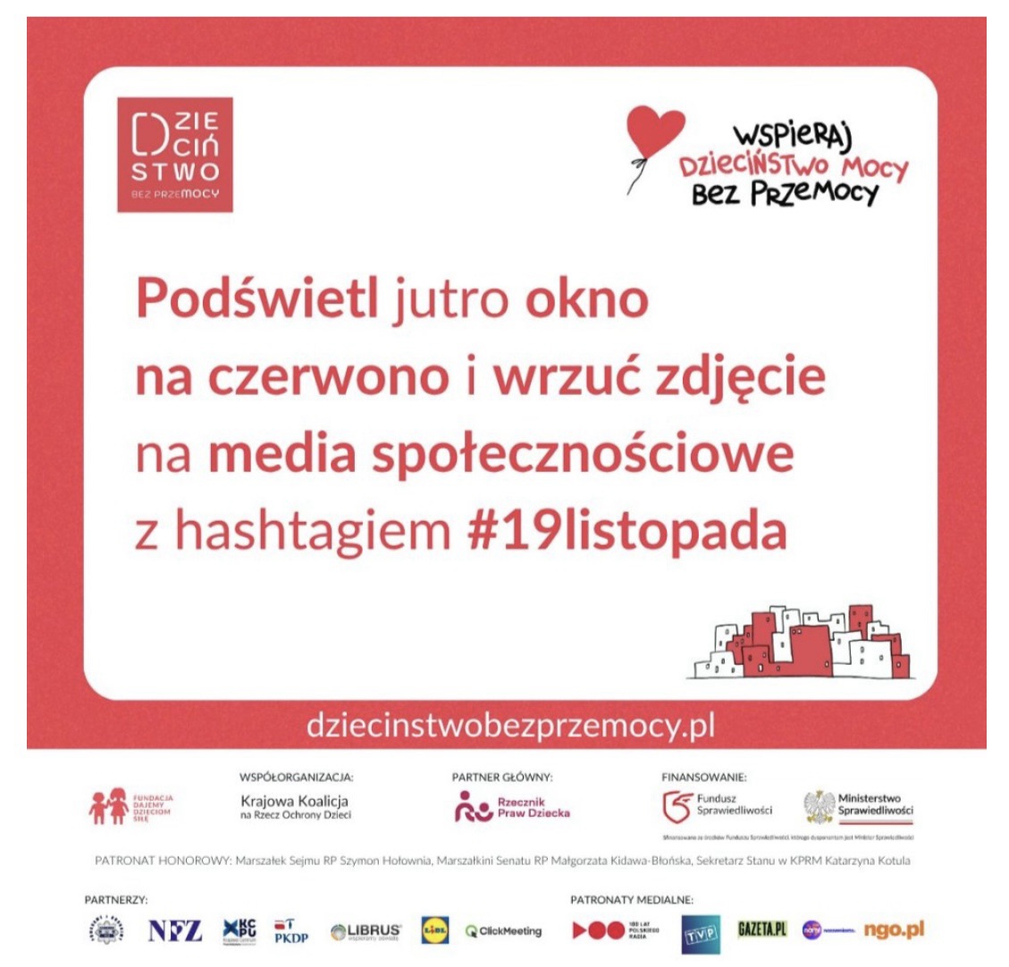 Data 19 listopada nie jest przypadkowa – to Międzynarodowy Dzień Przeciwdziałania Przemocy wobec Dzieci, a także kulminacja kampanii Dzieciństwo bez Przemocy, przygotowywanej wspólnie z Krajową Koalicją na rzecz Ochrony Dzieci.