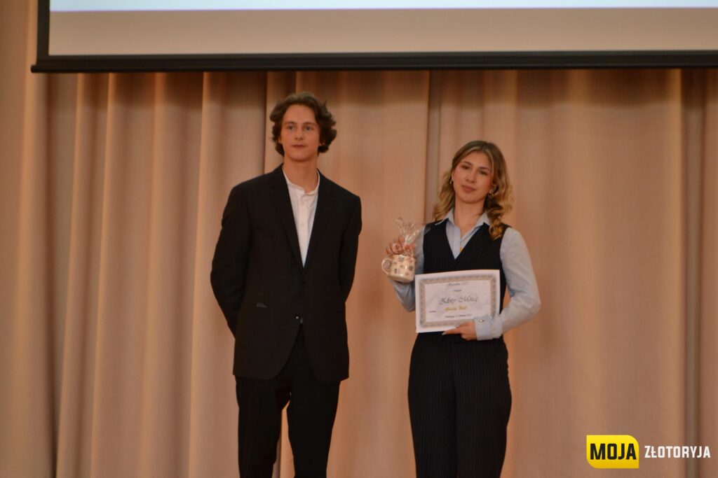 Uroczystość rozpoczęła się od wręczenia najważniejszych nagród. Pierwszą z nich – Nagrodę Starosty Rafała Miary – otrzymała Aniela Blat, uczennica znana z nieprzeciętnego zaangażowania i imponujących osiągnięć. Chwilę później sztabka złota od Burmistrza Pawła Kuliga trafiła do rąk Hanny Kowalskiej. Nagrodę Dyrektora Szkoły Beaty Franczak przyznano Wiktorii Jędrysiak.